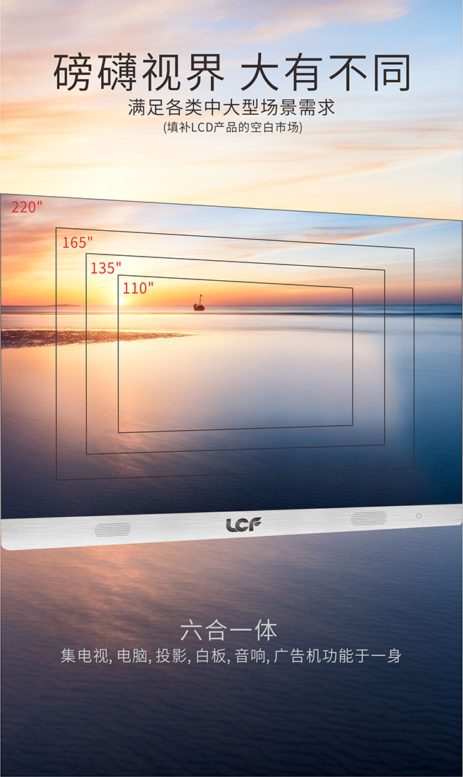 LED一体机的一大特点就是屏幕 面积大,这是LCD所无法代替的,所以LED一体机具有醒目、视觉冲击力强、视角范围广和色彩炫丽等特质,及良好视距及超清画面。LTV2.0拥有多种尺选择,支持110寸、135寸、165寸、220寸等多种尺寸选择,满足大中型室内场景需求。